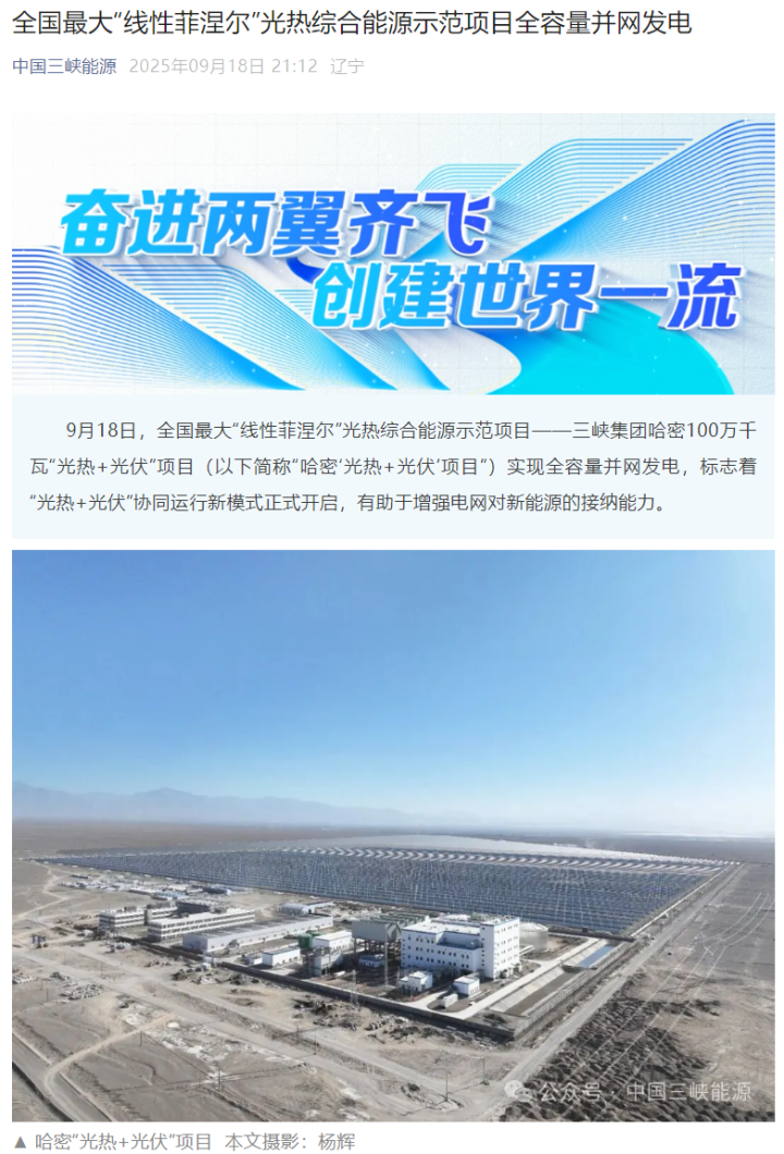 IT之家9月18日消息,全国最大“线性菲涅尔”光热综合能源示范项目——三峡集团哈密100万千瓦“光热+光伏”项目(以下简称“哈密‘光热+光伏’项目”)今日实现全容量并网发电,标志着“光热+光伏”协同运行新模式正式开启。